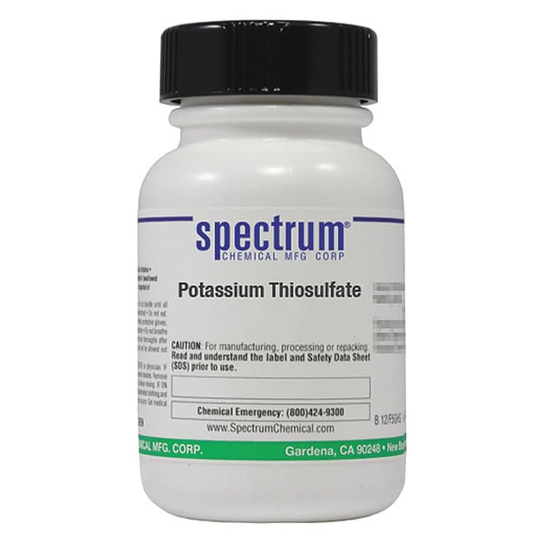Potassium Thiosulfate, Concentration 100 Percent, CAS Number 10294-66-3, Molecular Weight 190.32, Chemical Formula K2S2O3, Chemical Container Material Plastic, Chemical Container Type Bottle, Chemical Grade Reagent, Chemical Container Size 25 g, Chemical Family Type Bases, Shelf Life 24 mo
