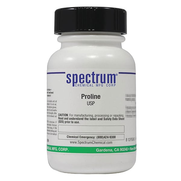 Proline, USP, CAS Number 147-85-3, Molecular Weight F.W. 115.13, Chemical Formula C5H9NO2, Chemical Container Material Plastic, Chemical Container Type Bottle, Chemical Grade USP, Chemical Container Size 25 g, Chemical Family Type Analytical Reagents, Shelf Life 24 mo