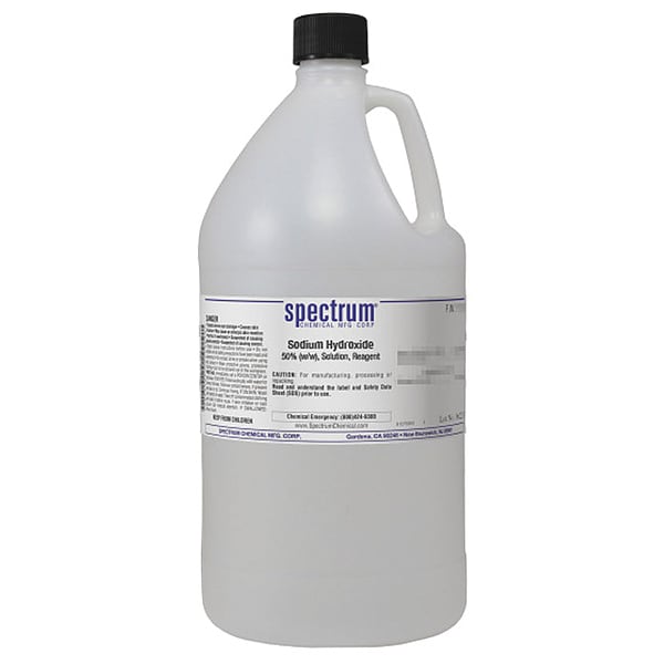 Sodium Hydroxide, Concentration 50 Percent w/w, CAS Number 1310-73-2, 7732-18-5, Molecular Weight 40, Chemical Formula NaOH, Chemical Container Material Plastic, Chemical Container Type Jug, Chemical Grade Lab, Chemical Container Size 4 L, Chemical Family Type Inorganic, Shelf Life 24 mo, Shipping Restrictions UN1824, Sodium Hydroxide, Solution, 8, PG II, Standards Not Applicable, Special Information Not Applicable
