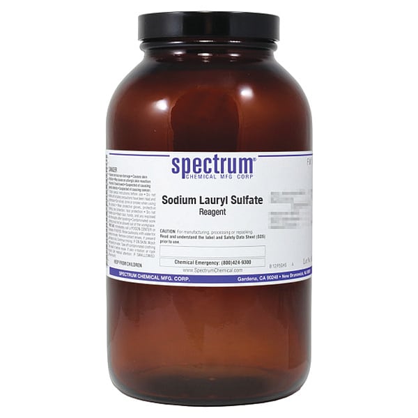 Sodium Lauryl Sulfate, Concentration Not Applicable, CAS Number 151-21-3, Molecular Weight 288.38, Chemical Formula C12H25O4SNa, Chemical Container Material Amber Glass, Chemical Container Type Bottle, Chemical Grade Lab, Chemical Container Size 500 g, Chemical Family Type Reagent, Shelf Life 24 mo, Shipping Restrictions Chemical Not Regulated For Transport, Standards Not Applicable, Special Information Not Applicable