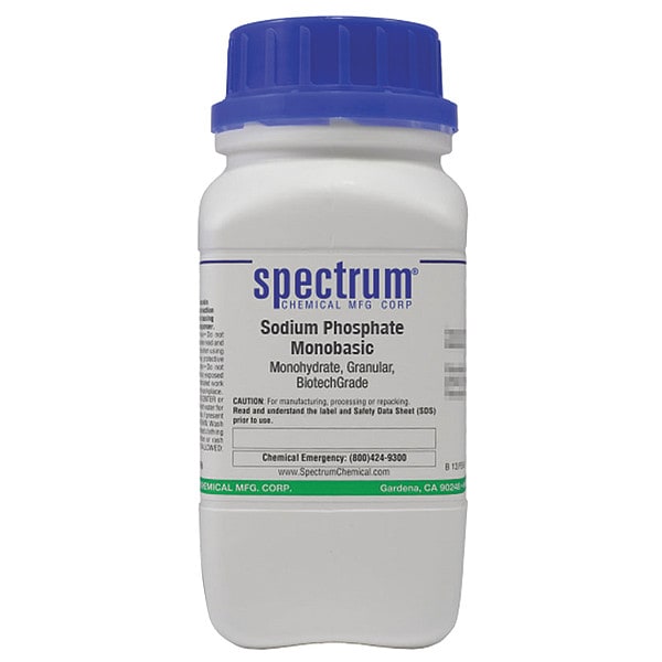 Sodium Phosphate - Monohydrate - Monobasic, Concentration Not Applicable, CAS Number 10049-21-5, Molecular Weight 137.99, Chemical Formula NaH2PO4�H2O, Chemical Container Material Plastic, Chemical Container Type Bottle, Chemical Grade Lab, Chemical Container Size 500 g, Chemical Family Type Reagent, Shelf Life 24 mo, Shipping Restrictions Chemical Not Regulated For Transport, Standards Not Applicable, Special Information Not Applicable