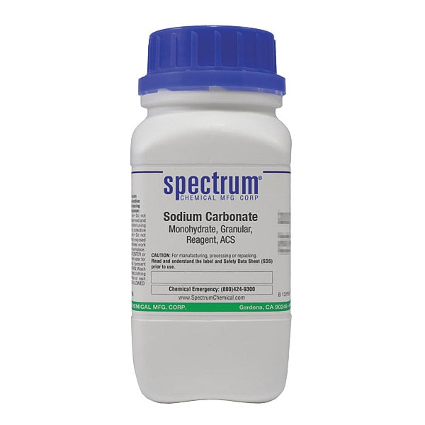 Sodium Carbonate, Monohydrate, Granular, Reagent, ACS, CAS Number 5968-11-6, Molecular Weight F.W. 124.00, Chemical Formula Na2CO3�H2O, Chemical Container Material Plastic, Chemical Container Type Bottle, Chemical Grade ACS, Chemical Container Size 500 g, Chemical Family Type Analytical Reagents, Shelf Life 24 mo