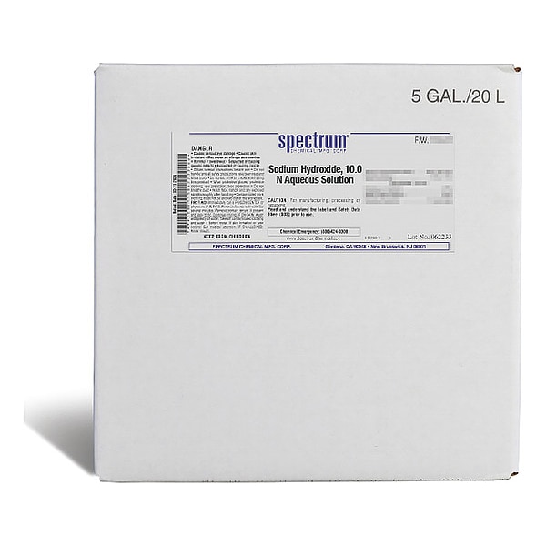 Sodium Hydroxide, Concentration 10 N, CAS Number 1310-73-2, 7732-18-5, Molecular Weight 40, Chemical Formula NaOH, APHA APHA, Chemical Container Material Plastic, Chemical Container Type Drum, Chemical Grade Lab, Chemical Container Size 20 L, Chemical Family Type Solution, Shelf Life 24 mo, Shipping Restrictions UN1824, Sodium Hydroxide, Solution, 8, PG II, Standards Not Applicable, Special Information Not Applicable