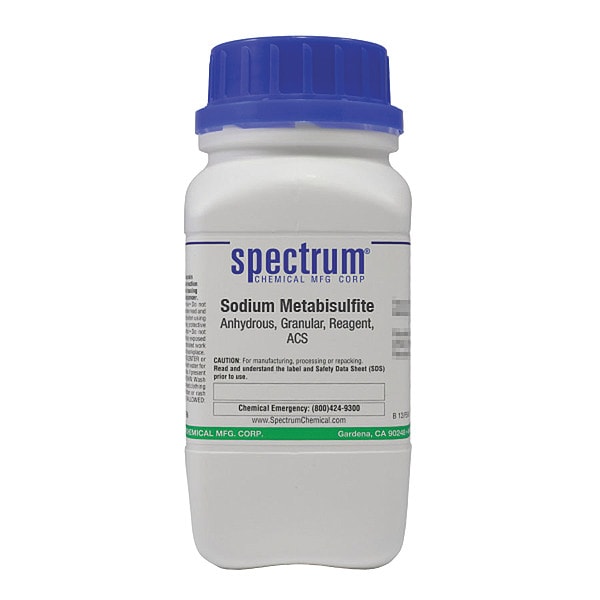 Sodium Metabisulfite - Anhydrous, Concentration Not Applicable, CAS Number 7681-57-4, Molecular Weight 190.11, Chemical Formula Na2S2O5, Chemical Container Material Plastic, Chemical Container Type Bottle, Chemical Grade ACS, Chemical Container Size 500 g, Chemical Family Type Reagent, Shelf Life 24 mo, Shipping Restrictions Chemical Not Regulated For Transport, Standards Not Applicable, Special Information Not Applicable