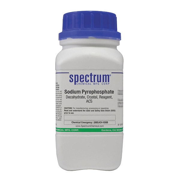 Sodium Pyrophosphate - Decahydrate, Concentration Not Applicable, CAS Number 13472-36-1, Molecular Weight 446.06, Chemical Formula Na4P2O7�10H2O, Chemical Container Material Plastic, Chemical Container Type Bottle, Chemical Grade ACS, Chemical Container Size 500 g, Chemical Family Type Reagent, Shelf Life 24 mo, Shipping Restrictions Chemical Not Regulated For Transport, Standards Not Applicable, Special Information Not Applicable