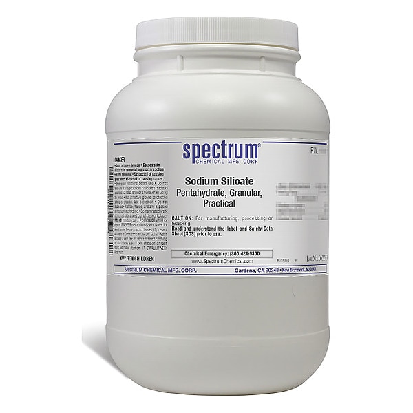 Sodium Silicate, Pentahydrate, Granular, Practical, CAS Number 10213-79-3, Molecular Weight F.W. 212.15, Chemical Formula Na2SiO3�5H2O, Chemical Container Material Plastic, Chemical Container Type Bottle, Chemical Grade Technical, Chemical Container Size 2.5 kg, Chemical Family Type Analytical Reagents, Shelf Life 24 mo, Shipping Restrictions UN3253, Disodium trioxosilicate, 8, PG III