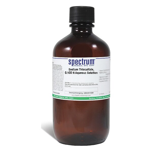 Sodium Thiosulfate, Concentration 0.1 N, CAS Number 10102-17-7, 497-19-8, 7732-18-5, Molecular Weight 18.02 F.W; 248.19 F.W; 105.99 F.W, Chemical Formula H2O; Na2S2O3�5H2O; Na2CO3, APHA APHA, Chemical Container Material Amber Glass, Chemical Container Type Bottle, Chemical Grade Lab, Chemical Container Size 1 L, Chemical Family Type Solution, Shelf Life 24 mo, Shipping Restrictions Chemical Not Regulated For Transport, Standards Not Applicable, Special Information Not Applicable