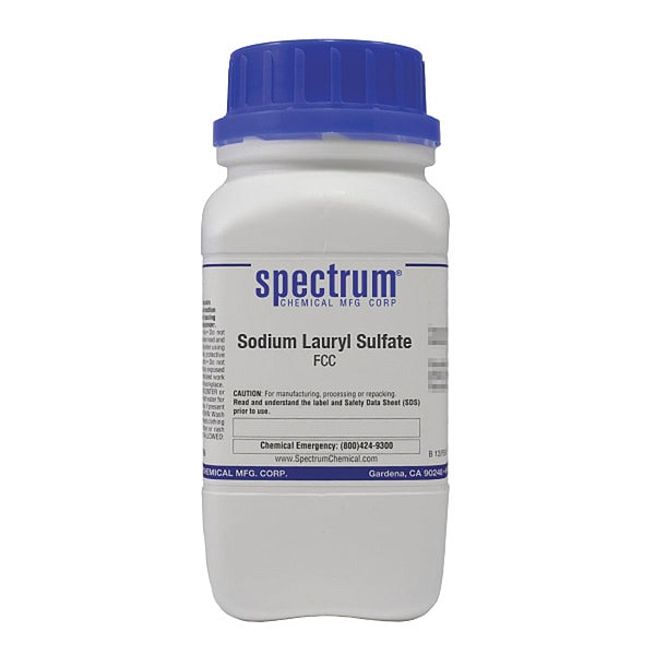 Sodium Lauryl Sulfate, Concentration Not Applicable, CAS Number 151-21-3, Molecular Weight 288.38, Chemical Formula C12H25O4SNa, Chemical Container Material Plastic, Chemical Container Type Bottle, Chemical Grade FCC, Chemical Container Size 125 g, Chemical Family Type Reagent, Shelf Life 36 mo, Shipping Restrictions Chemical Not Regulated For Transport, Standards Not Applicable, Special Information Not Applicable