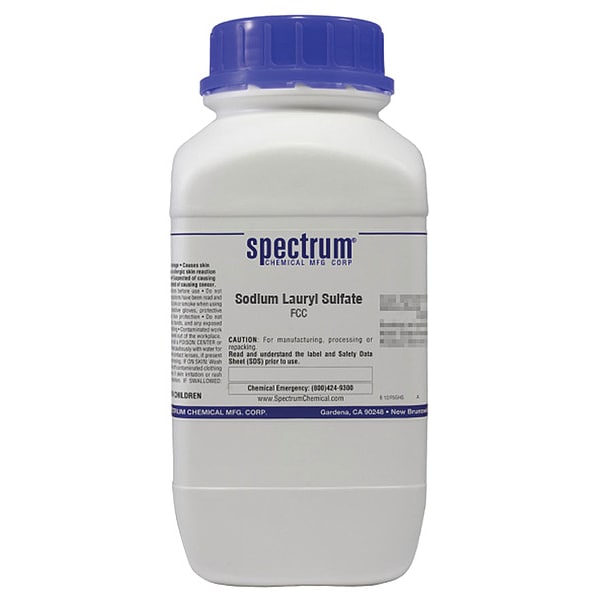 Sodium Lauryl Sulfate, Concentration Not Applicable, CAS Number 151-21-3, Molecular Weight 288.38, Chemical Formula C12H25O4SNa, Chemical Container Material Plastic, Chemical Container Type Bottle, Chemical Grade FCC, Chemical Container Size 500 g, Chemical Family Type Reagent, Shelf Life 36 mo, Shipping Restrictions Chemical Not Regulated For Transport, Standards Not Applicable, Special Information Not Applicable