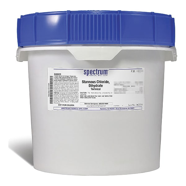 Stannous Chloride, Dihydrate, Technical, CAS Number 10025-69-1, Molecular Weight F.W. 225.65, Chemical Formula SnCl2�2H2O, Chemical Container Material Plastic, Chemical Container Type Drum, Chemical Grade Technical, Chemical Container Size 12 kg, Chemical Family Type Analytical Reagents, Shelf Life 24 mo, Shipping Restrictions UN1759, Corrosive solid, n.o.s. (stannous chloride), 8, PG III