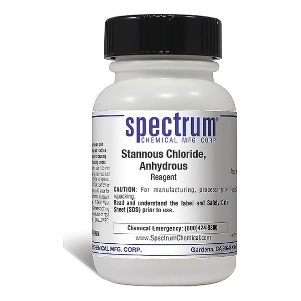 Stannous Chloride, Anhydrous, Reagent, CAS Number 7772-99-8, Molecular Weight 189.61, Chemical Formula SnCl2, Chemical Container Material Plastic, Chemical Container Type Bottle, Chemical Grade Reagent, Chemical Container Size 100 g, Chemical Family Type Analytical Reagents, Shelf Life 24 mo, Shipping Restrictions UN1759, Corrosive Solid, n.o.s. (Stannous Chloride), 8, PG III