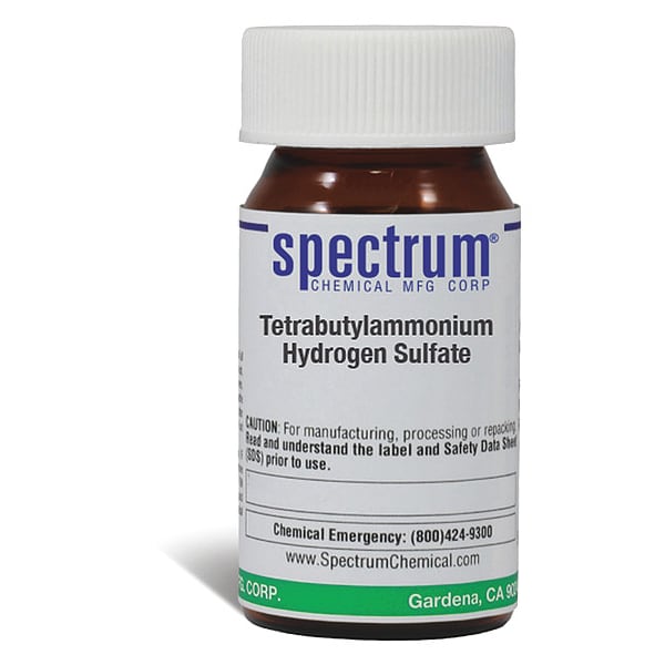 Tetrabutylammonium Hydrogen Sulfate, Concentration 100 Percent, CAS Number 32503-27-8, Molecular Weight 339.54, Chemical Formula C16H36N.HSO4, Chemical Container Material Amber Glass, Chemical Container Type Bottle, Chemical Grade Reagent, Chemical Container Size 5 g, Chemical Family Type Bases, Shelf Life 24 mo