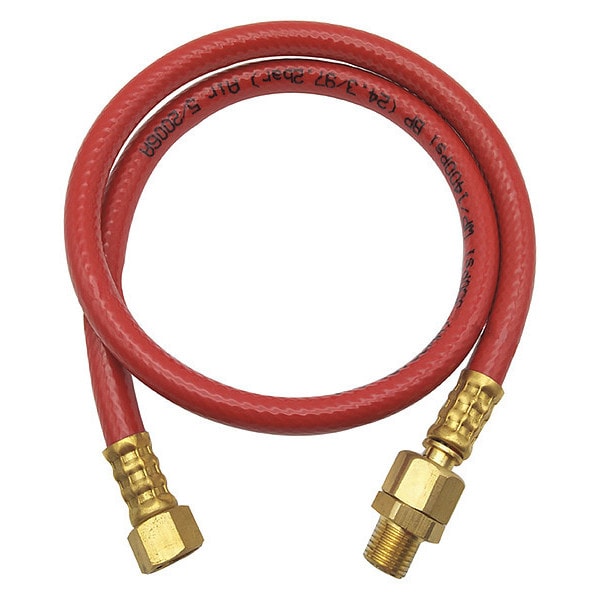 Snubber Hose, Hose Inside Dia. 1/4 in, Hose Outside Dia. 1/2 in, Hose Length 32 in, Red, Hose Tube Material PVC, Hose Cover Material PVC, Max. Working Pressure @ 70 F 300 psi, Temp. Range -10 Degrees to 150 Degrees F, Safety Factor 4:1, Hose Fitting A Material Brass, Hose Fitting B Material Brass, Hose Fitting A Type MNPT, Hose Fitting B Type FNPT, Hose Fitting A Size 1/4 in, Hose Fitting B Size 1/4 in, Hose Configuration Coupled Assembly
