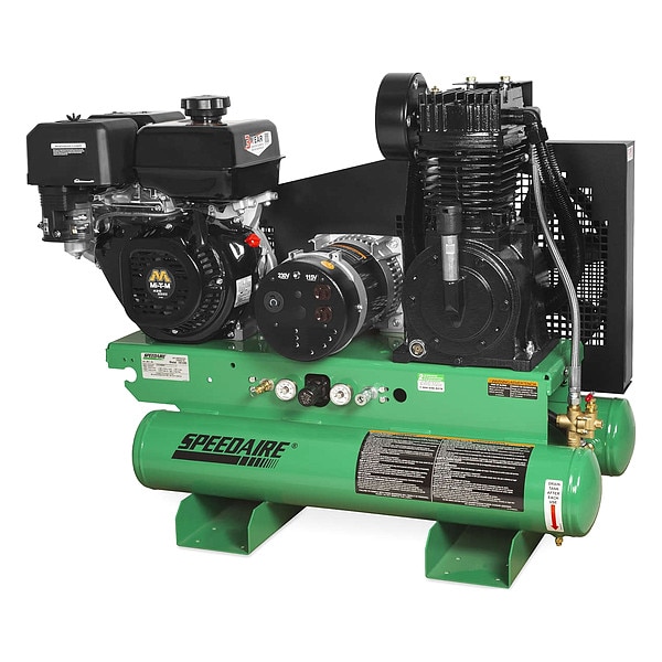 Portable Air Compressor/Generator, Fuel Type Gasoline, Number of Stages 2, Engine Output Power 14 hp, Engine Brand Mi-T-M, Free Air Flow Rate 15.7 cfm, Free Air Flow Rate @ Maximum Pressure 15.7 cfm, Maximum Operating Pressure 175 psi, Air Tank Size 8 gal, Air Tank Style Twin Stack, Starter Type Recoil, Pump Type Reciprocating, Maximum Speed 3,500 RPM, Duty Cycle Continuous, Average Pump Life 2,000 hr, Lubrication Type Splash Lubricated, Pump Oil Capacity 24.7 fl oz, Engine Oil Capacity 37 fl oz
