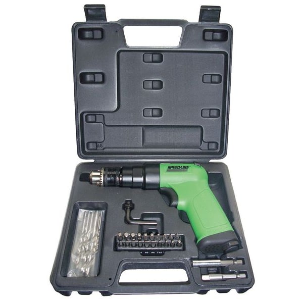 Drill, Pistol Body Style - Air Tools, Free Speed 2,000 RPM, Torque 5.40 ft-lb, Average CFM @ 15 Second Run Time 3.50, CFM @ Full Load 20.0, Required Pressure 90 psi, Min. Hose Size 3/8 in, Handle Material Composite, Variable Speed Yes, Throttle Type Trigger, Bearings Ball, Housing Material Composite, Gear Train Planetary, Overall Length 8 1/4 in, Right Angle Length 7 1/8 in, Tool Weight 1.9 lb