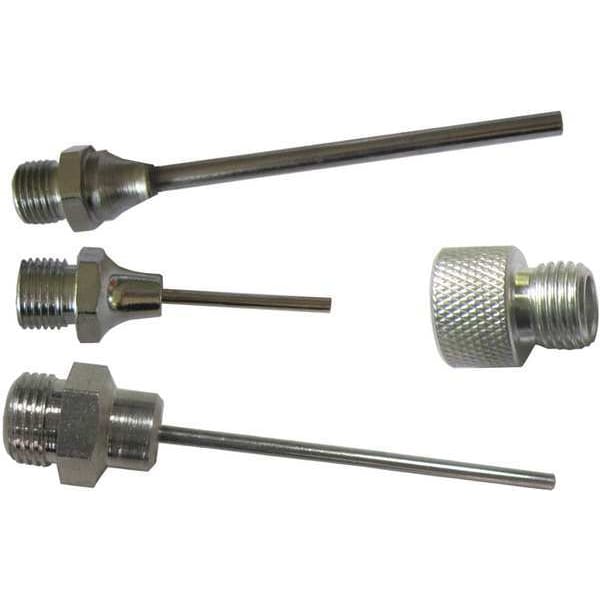 Air Gun Nozzle Set, Compatible with Manufacturer Part Number 22YK46, 22YK47, 22YK49, 22YK50, Compatible with Grainger Part Number 22YK46, 22YK47, 22YK49, 22YK50, Nozzle Tip Material Brass, Zinc, Tube Material Steel, Overall Length 1 in, 2 in, 3 in, Inlet Size 1/2 In.-20 MUNF, OSHA Pressure Compliant No, Sound Level 82 dB, Air Outlet Size 1/8 in, Diameter 1/8 in, Air Flow Pattern Cuspate