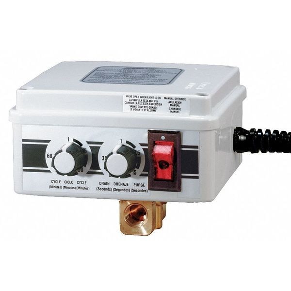 Timed Electric Auto Drain Valve, Pipe Size 1/4 in NPT, Drain Size 1/4 in, Drain Rate 4.0 gpm, Adjustable Drain Cycle 1 min to 60 min, Purge Time 1 sec to 30 sec, Voltage 115V, Max. Pressure 200 psi, Operating Temp. Range 35 Degrees to 165 Degrees F, Hz 60, Amps AC 0.25, Enclosure NEMA 1, Body Material Cycolac T-31445, Overall Height 3 1/4 in, Overall Width 3 5/16 in, Overall Depth 4 3/16 in, Includes 6 ft Heavy Duty Grounded Power Cord, Y Strainer