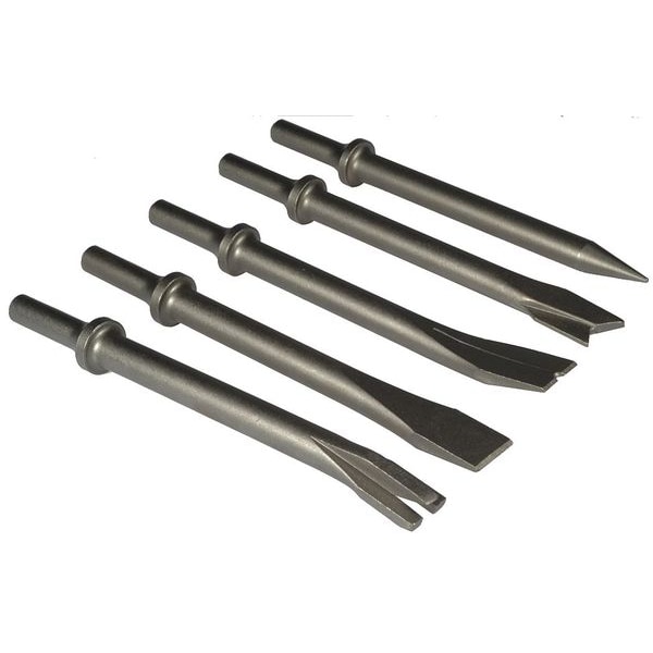 Chisel Set, Non-Sparking No, Shank Shape Round, Shank Size 0.401 in, Overall Length 8 in, Material Steel, Chisel Tip Width 13/32 in, Chisel Scaler Style IR, Chisel Collar Type Round, Compatible with Product Type Air Hammer, Package Quantity 5
