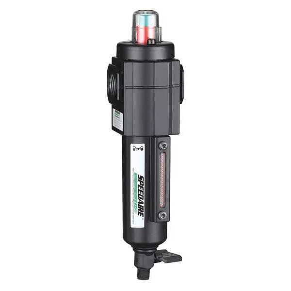 Pneumatic Oil Filter, Filter Type Coalescing, Air Inlet Size 1/4 in, Air Inlet Type NPT, Maximum Flow Rate 10.5 cfm, Maximum Operating Pressure 250 psi, Maximum Operating Temperature 150 Degrees F, Overall Width 2 in, Overall Height 7 15/16 in, Drain Included Yes, Filter Bowl Material Metal, Drain Type Manual, Series Compact, Differential Pressure Indicator Included No, Air Flow Direction Left to Right, Air Inlet Gender Female, Air Outlet Gender Female, Air Outlet Size 1/4 in