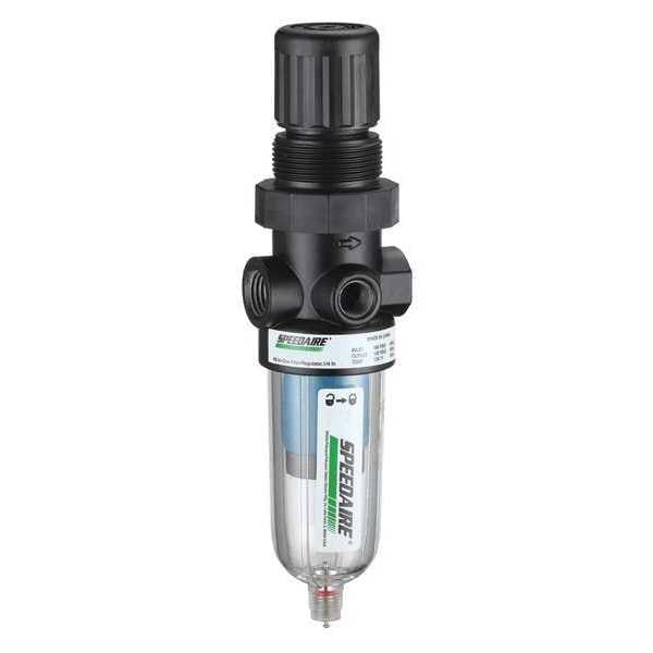 Filter-Regulator, Filter Bowl Material Polycarbonate, Air Inlet Size 1/4 in, Air Inlet Type NPT, Maximum Flow Rate 4 cfm, Filter Rating 0.01 micron, Filter Type Particulate, Maximum Operating Pressure 150 psi, Drain Type Manual, Pressure Gauge Included No, Body Material Zinc, Overall Width 1 5/8 in, Series Miniature, Adjustment Location Top, Adjustment Mechanism Knob, Adjustment Mechanism Material Reinforced Nylon, Air Flow Direction Left to Right, Air Inlet Gender Female