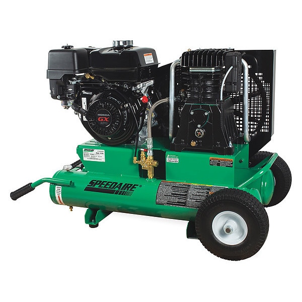 Portable Gas Air Compressor, Fuel Type Gasoline, Number of Stages 2, Engine Output Power 9 hp, Engine Brand Honda, Free Air Flow Rate 18.3 cfm, Free Air Flow Rate @ Maximum Pressure 17.5 cfm, Maximum Operating Pressure 175 psi, Air Tank Size 8 gal, Air Tank Style Wheelbarrow, Sound Level Not Rated, Pump Type Oil Lubricated, Maximum Speed 864 RPM, Duty Cycle Continuous, Average Pump Life 2,000 hr, Lubrication Type Splash Lubricated, Pump Oil Capacity 24.7 oz, Engine Oil Capacity 37 oz