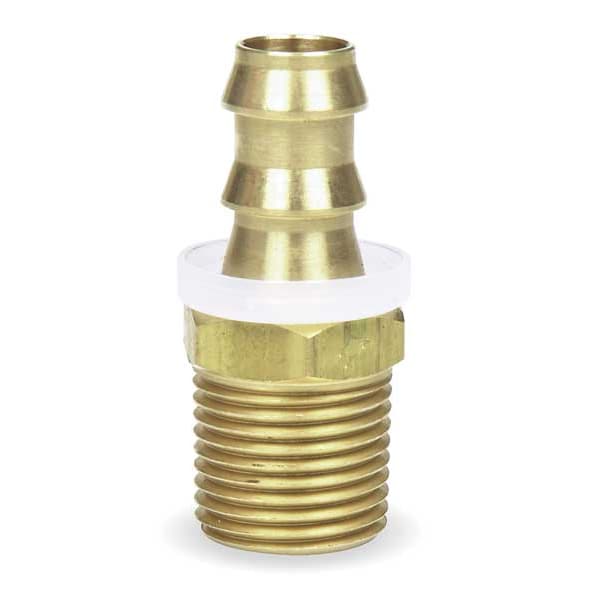 Push-On Hose Fitting, For Hose I.D. 1/2 in, Barb Size 1/2 in, Rigid, Fitting Shape Straight, Hex Head Size 55/64 in, Hose Fitting A Gender Male, Hose Fitting B Gender Male, Hose Fitting A Size 1/2 in, Hose Fitting B Size 1/2 in, Hose Fitting A Connection Type Hose Barb, Hose Fitting B Connection Type NPT, Fitting Material Brass x Brass, H59, Reusable Yes, 250 psi