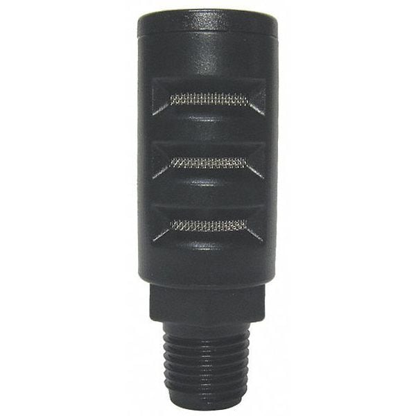 Silencer Muffler, Air Inlet Size 1/4 in, Air Inlet Type NPT, Air Inlet Gender Male, Hex Size 11/16 in, Filter Element Material Mesh SST, Maximum Operating Pressure 150 psi, Maximum Operating Temperature 120 Degrees F, Fitting Material Nylon, Air Outlet Gender Male, Maximum Flow @ 100 psi 33 cfm