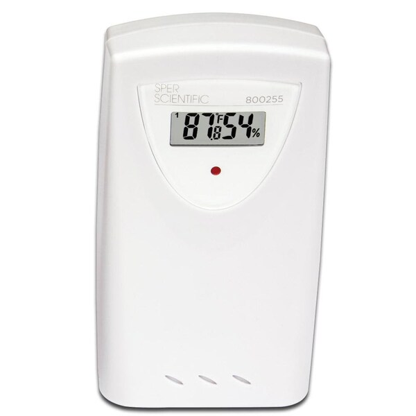 Additional sensor for Sper Scientific wireless humidity/temperature monitor set 800254. Additional humidity temperature for Sper Scientific 800254 Wireless sensors broadcast to monitor from up to 100' 30M away without obstructions View Temp and humidity on sensor 5 year warranty, CE Comes with 2 AA batteries Specifications Remote Wireless Sensor Range Resolution Accuracy Operating Temperature: -4 degrees F to 158 degrees F-20 degrees C to 70 degrees C 0.2 degrees F0.1 degrees C ±2 degrees F±1 degrees C Operating RH%: 10 to 95%@25 degrees C 77 degrees F 1% RH ±5% RF Transmission Frequency: 433 MHz RF Transmission Range: 30 meters in open area Temperature Sensing Rate: 43 to 47 seconds Downloads Instruction Manual Product Brochure Comparison Chart Comparison Chart