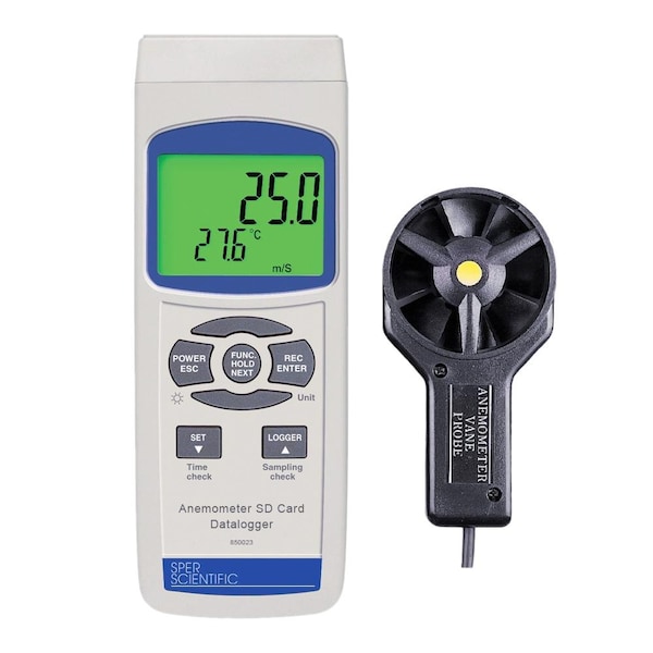 Reads air velocity and temperature, and functions as a type K or J thermometer. Records data onto standard SD memory cards. When full, simply exchange SD cards for unlimited data storage. The removable SD card is easy to transport and insert into a computer’s memory card slot or SD card reader. Uploads pre-formatted data to Excel, without the need for additional software and cables. Each data set includes airspeed, air temperature, time and date. Features min/max, auto power off, low battery indicator and hold function. Also reads thermocouple temperature with optional probes. This well-made unit is extremely accurate with fast response times and includes a fold-out tripod and large, easy-to-read backlit LCD. Comes ready to use in a soft carrying case complete with a detachable probe, 6 AA batteries, instruction manual and an SD card. Uses optional USB Power Cable 840058, or AC Adapter 840097. Dimensions: 7 × 23⁄4 × 13⁄4 178 × 70 × 44 mmWeight: 1 lb. 0.45 kg Specifications Unit of Measure: Range: Resolution: Accuracy: Ft/min: 79 to 6890 1 ±2%rdg + 40 FPM Km/h: 1.4 to 126 0.1 ±2%rdg + 0.8 Km/h mph: 0.9 to 78.3 ±2%rdg + 0.4 mph Knots: 0.8 to 68 ±2%rdg + 0.4 Knots m/s: 0.4 to 30 ±2%rdg + 0.2 m/s Type K: -58 to 2372 degrees F-50 to 1300 degrees C ±0.4% FS + 1.8 degrees F±0.4% FS + 1 degrees C Type J: -58 to 2192 degrees F-50 to 1200 degrees C Downloads Instruction Manual Product Brochure Comparison Chart Comparison Chart Video