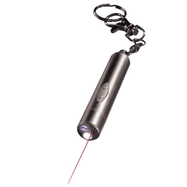 UV Keychain Laser Light can be used as both a Laser Pointer and LED Flashlight. Press one end of the button and get a bright 650 nm red laser pointer. Press the other end and get high intensity white LED light for inspection and illumination. Press the same side again and get 400 nm ultra-violet light. All packed into a tiny pocket sized device includes keychain. Red Laser Light ApplicationsThe beam is sharp, very bright, and has sturdy construction and long battery life allowing for heavy use as a teaching tool for: Science Presentations Conferences Lectures Seminars Planetariums Dimensions: 31⁄4; x 1⁄2; 83 x 13.5 mm Weight: 1.3 oz. 38 g Specifications Laser Wavelength: 650 nM UV Wavelength: 400 nM Power: 4 button cell batteries included Downloads Instruction Manual Product Brochure