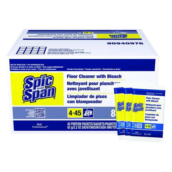 Bleach Floor Cleaner, Cleaner Form Powder, Container Size 2.2 oz, Container Type Packet, For Floor Type Ceramic, Concrete, Laminate, Linoleum, Terrazzo, Vinyl, Maximum Drying Time 1 hr, Minimum Drying Time 30 min, pH Level 11, pH Value Alkaline, Properties Low Foam, No Rinse Required, Nonflammable, Concentrated, Recommended Dilution Ready to Use, Standards OSHA, Color White, Fragrance Bland, Primary Chemical Bleach, Package Quantity 45