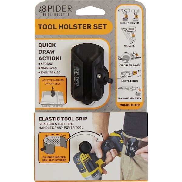 The Spider Tool Holster is designed to change the way you carry your power tools no more setting your tool down or trusting it to a tool pouch. Clip the Holster to any belt secure the Elastic Tool Grip to your tool and slide it into the locking holster and youre ready to go. Works with any hand held power tool including impact drivers reciprocal saws nailers etc.