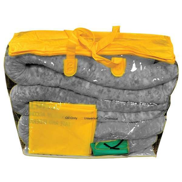 Spill Kit/Station, Fluids Absorbed Universal, Volume Absorbed Per Kit 5 gal, Container Type Bag, 23 1/2 in W x 8 1/2 in H Container Size, Gray, Sorbents Included (20) Single-Weight 16 in x 18 in Universal Pads, (3) Universal Socks (3 in x 4 ft), PPE Included (1) Pair Nitrile Gloves, (1) Pair Goggles, Additional Components Included Clear Zipper Bag, Lockable No, Static Dissipative No, UV Resistant No