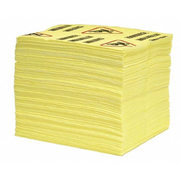 Product Type Sorbent Pad, Fluids Absorbed Universal, For Use With Chemical or Metal Type Hazardous Materials, Size 15 in x 19 in, Volume Absorbed Per Pad 31 5/8 oz, Volume Absorbed per Pkg. 15 gal, Color/Pattern Yellow, Material Polypropylene, Number of Layers 3, Perforated Perforated, Perforated Size 7 1/2 in x 19 in, Package Quantity 100