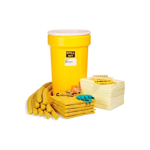 Spilltech spkhz-55 hazmat 55-gallon spill kit pre-packed in an x-rated dot-approved 55-gallon overpack. kit includes: 130 pieces 100 15" x 19" pads 10 3" x 4' socks 5 18" x 18" pillows 2 pairs nitrile gloves 2 pairs safety goggles 1 emergency guide book 4 disposal bags & ties 6 tamper proof seals