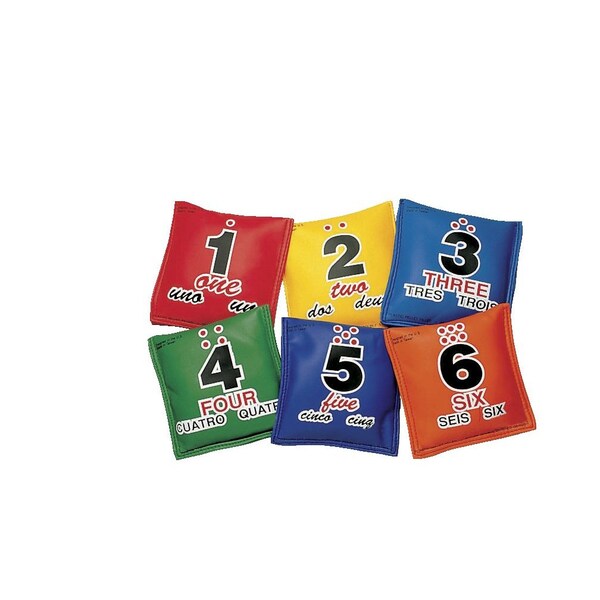 Toss, turn, and learn! These Utility Sequencing Bean Bags triple the fun and education with a combination of math, literacy skills, and colors featured on each bag. Words appear in upper-case manuscript on one side and lower-case cursive on the opposite side in 3 languages: English, French, and Spanish. Each bag also contains a number, which is reinforced with matching dot sets for helping to teach counting skills. Each 4-ounce bag features full-sized, double-stitched and reinforced vinyl shells on the outside, and secured plastic pellets on the inside. Each bag measures 5 x 5 inches. Set includes 6 beanbags in assorted colors.