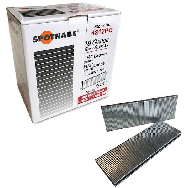 Spotnails 4812PG 1-1/2in 18 Gauge 1/4in Narrow Crown Galv Staples 5000ct Length : 1-1/2inFinish: GalvanizedPoint: ChiselQuantity: 5000 per box For Use In: Spotnails: WS4840LM, WS4840W6, WS4840W2W5, TS4825, FS4825Senco: SLS15MG, SLS20, SLS25XP, SKS-L, SKSN4450, KMN4450, LN4450, SLS18FinishPro 2N1Duo-Fast: SS1848F/1832/1848/1848SL, KN1848A, KB1836, BN1832, DNS-1840Porter: NS100 1/2in-1in, NS150 1/2in-1in, NSS150, NS100A/B, NS150A/BHitatchi: N3804AB2/3, N3804ABGrip-Rite: GRTSN150Dewalt: D51420K, D51422KMakita: AT638Max: TA238/18-6Rigid: R150FSAKihlberg: PN6040VFasco: F20T 90-30 CT, F20T 90-40 CT, R3C 90-40 CTCraftsman: 18406 1/2in-1in, 183671/2in-1 1/2inJamerco: JTS061825 1/2in-1in, JTS061838A 1/2in-1 1/2in, JTS061838H 1/2in-1in