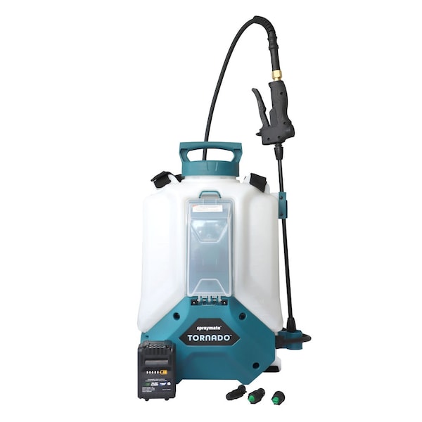 18V Li-ion Battery, 21V Charger, Adjustable, 25-Degree Fan Nozzle, 0-Degree Pin Stream, 4-Gallon Tank, Backpack Straps, Top Holster, Bottom Holster, Tank Strainer, UV-Resistant 5-Foot Hose, Inline Spray Handle