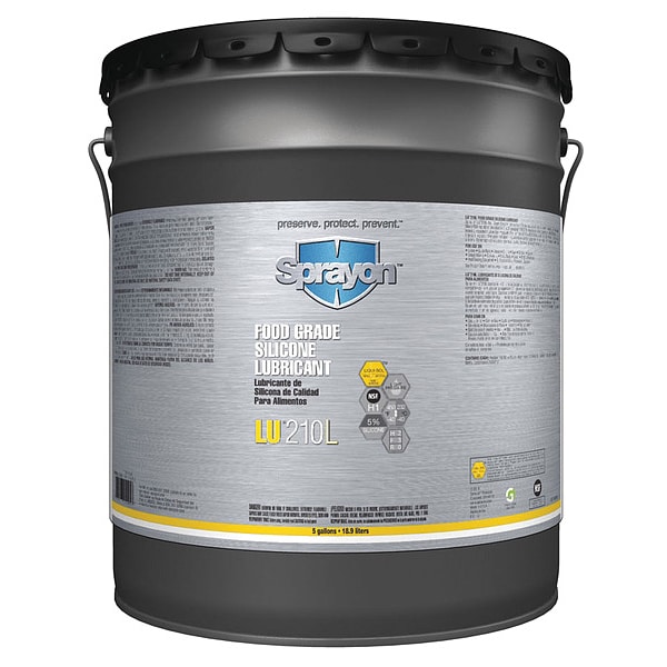 General Purpose Lubricant, Wet, Sprayon, LU 210, Net Fill 5 gal, Container Size 5 gal, Lubricant Container Pail, Silicone, No Additives Primary Additive, Min. Operating Temp. -40 Degrees F, Max. Operating Temp. 450 Degrees F, NSF Rating H1, 50 State VOC Compliant No, VOC Content 95 Percent, Lubricant Color Colorless, Odorless No, Flammable Flammability, Flammable Aerosol (Category 2), Flash Point -10 Degrees F, Standards Category Code H1, NSF Registration #115039