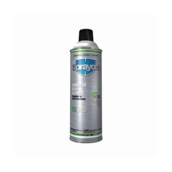 SPRAYON CD885 STAINLESS STEEL CLEANER AEROSOL CLEANS, POLISHES, BRIGHTENS AND PROTECTS STAINLESS STEEL AND OTHER METAL SURFACES, SUCH AS CHROME AND ALUMINUM. IT CAN ALSO BE USED ON PORCELAIN, CERAMIC TILE AND LAMINATED SURFACES. WATER SPOTS, SPILLS, FOOD SOILS AND OIL BASED STAINS ARE EASILY REMOVED. POLISHES TO A NON-GREASY FILM. INVISIBLE COATING RESISTS FURTHER SOILING, FINGERPRINTS, WATERMARKS AND RUSTING.