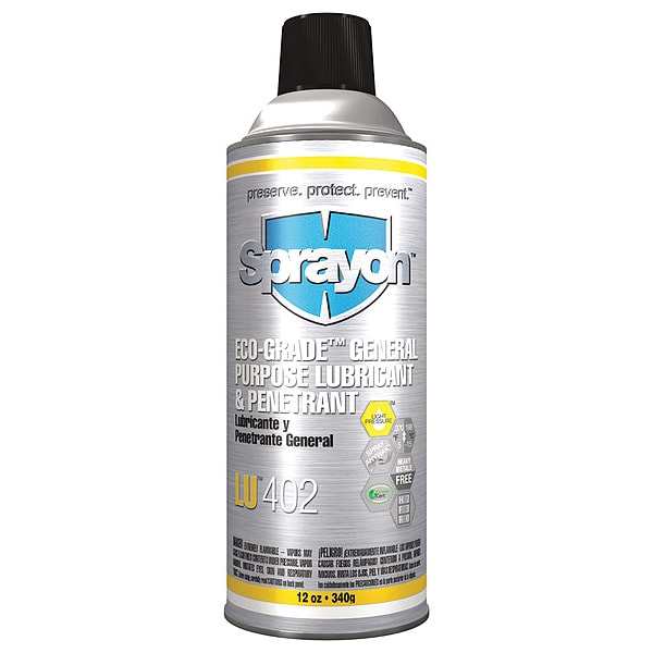 General Purpose Lubricant, Wet, Sprayon, LU402, Net Fill 12 oz, Container Size 16 oz, Lubricant Container Aerosol Can, Vegetable Oil, No Additives Primary Additive, Min. Operating Temp. 5 Degrees F, Max. Operating Temp. 370 Degrees F, NSF Rating Not Rated, 50 State VOC Compliant No, VOC Content 15 Percent, Lubricant Color Yellow, Odorless No, Flammable Flammability, Flammable Aerosol (Category 2), Flash Point -20 Degrees F, Standards RoHS 2011/65/EU Compliant, No USDA Certified Biobased Product