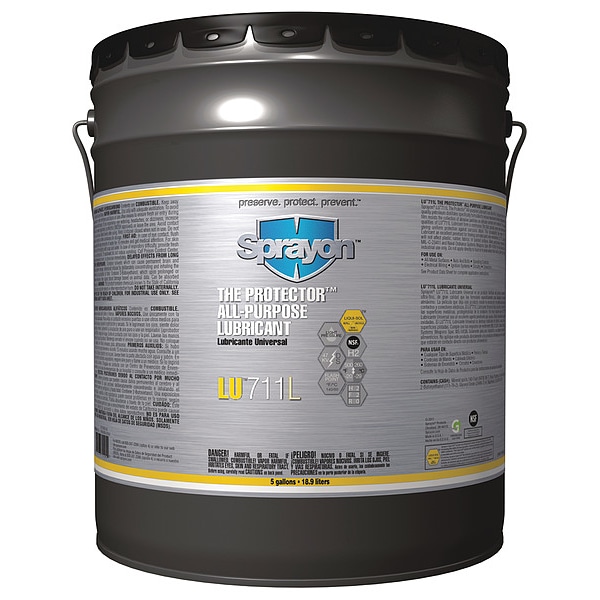 General Purpose Lubricant, Wet, Sprayon, LU 711, Net Fill 55 gal, Container Size 55 gal, Lubricant Container Drum, Mineral Oil, No Additives Primary Additive, Min. Operating Temp. -20 Degrees F, Max. Operating Temp. 500 Degrees F, NSF Rating Not Rated, 50 State VOC Compliant No, VOC Content 74.9 Percent, Lubricant Color Amber, Odorless No, Flammable Flammability, Flammable Aerosol (Category 2), Flash Point 140 Degrees F