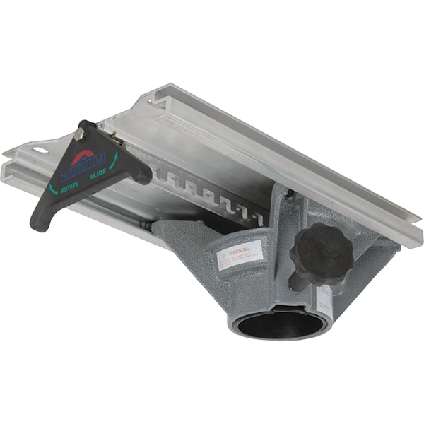 High-strength aluminum, large 7-1/4" x 13" platform. Travels 6" forward and backward on self-lubricating pads. Rotates 360°. Automatically locks in forward position. Dual function activator handle operates slide as well as swivel. Handle telescopes up to 3". Adds 1-1/2" to height of pedestal.
