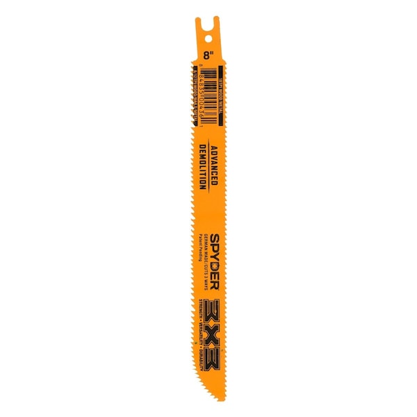 The double-edged Spyder 3X3 reciprocating saw blade lets you make multi-directional cuts without flipping your saw over. 8% Bi-metal cobalt cutting edges power through metals, wood with nails, and demolition tasks without overheating or wearing out. The rounded tip plunge cuts into drywall and other materials for added cutting versatility. Two cutting edges means 2x the life in each 3X3 blade. Exceptional strength, versatility and durability.