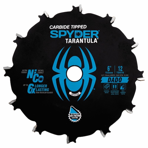 The Spyder Tarantula Dado Blade Set is the ideal choice for ultra clean cuts in wood materials. Over-sized and resharpenable NiCo teeth are sharpened in an alternating tooth grind with a flat grind ATG+F to provide clean cuts in both soft and hard woods. Tracking straight with reduced friction, heat and noise, Tarantula circular saw blades are the professional choice for cutting groves in all new wood materials from 1/4-in to 7/8-in in width. Up to 6x the life of standard carbide blades. Set includes: 2 12-tooth cutting blades, 3 2-tooth chipper blades, 3 spacers, 8 alignment shims.