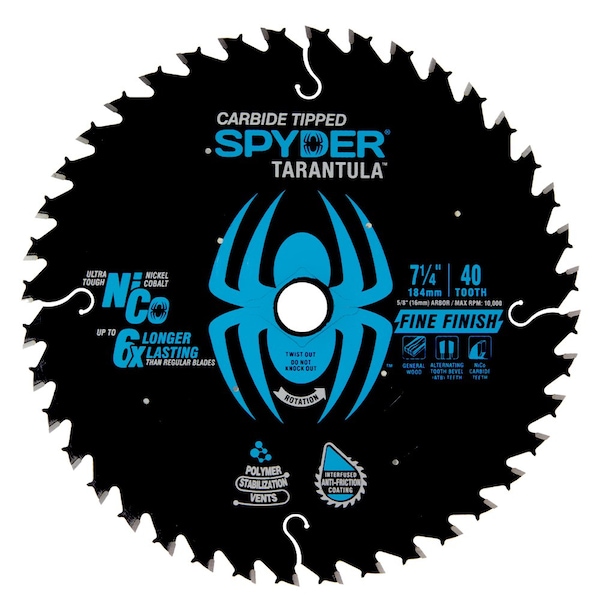 Rip and crosscut with ease with Spyder Tarantula Fine and Ultra Fine circular saw blades. NiCo teeth are sharpened 3x to provide clean cuts and exceptionally long life. Tracking straight with reduced friction, heat and noise, the Tarantula circular saw blade is the professionals choice for framing and construction. Fine and ultra fine blades are for use in new wood materials and provide the cleanest cuts on soft and hard woods, trim, MDF and plywood. Up to 6x the life of standard carbide blades.