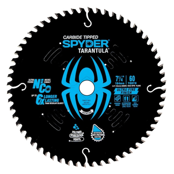 Rip and crosscut with ease with Spyder Tarantula Fine and Ultra Fine circular saw blades. NiCo teeth are sharpened 3x to provide clean cuts and exceptionally long life. Tracking straight with reduced friction, heat and noise, Tarantula circular saw blades are the professionals choice for framing and construction. Fine and ultra fine blades are for use in new wood materials and provide the cleanest cuts on soft and hard woods, trim, MDF and plywood. Up to 6x the life of standard carbide blades.