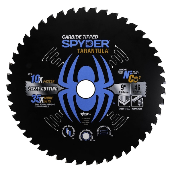 Spyder Tarantula metal-cutting circular saw blades are the ideal choice for clean cutting steel and other metal profiles. These high-performance blades last up to 35x longer than standard bonded abrasive cutting wheels and make those cuts up to 10x faster. Ultra tough NiCo2 carbide cutting teeth, made with upgraded nickel cobalt, feature a modified triple chip grind for unsurpassed cutting speed, life, and cleanliness - expelling larger chips with less cutting heat, dust, and debris. An interfused anti-friction coating prevents blade binding and polymer-filled stabilization vents reduce noise and vibration for ultra-precise burr-free cuts. Tarantula metal-cutting saw blades are compatible with cordless and corded circular saws and can be used to cut steel and metal profiles of various thicknesses. Ideal for steel bar, sheet, extrusions, studs, channel, angle iron, conduit, pipe, rebar, rods and more.
