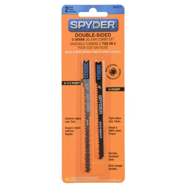 Jig saw combo set. -Double sided. -U shank. -Durable hardened steel. -One 4.5in 8-11.5 TPI/DDP extreme radius cuts fast on wood. -One 4in 10 TPI/DPP tight radius cuts clean on multi surfaces. -2 piece set