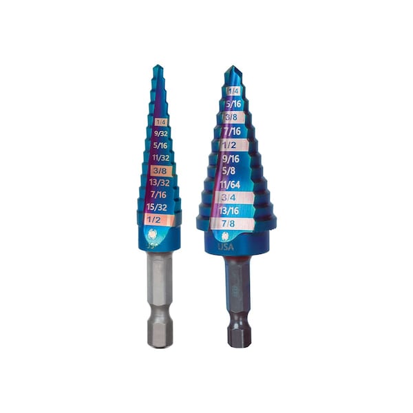 Step Drill Bit Set, Cobalt Alloy Steel, Black Oxide, Quick-Change Hex, Number of Drill Bits 2, Shank Length 1 in, Shank Hex Size 1/4 in, Package Quantity 2